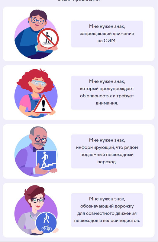 Задание 1: Дорожные знаки. Внимательно рассмотрите знаки и разберитесь, что каждый из них обозначает. После этого переходите к заданию: прочитайте запросы людей и правильно соберите комбинацию дорожных знаков для каждого случая! Будьте внимательны — от этого зависит безопасность на дороге.